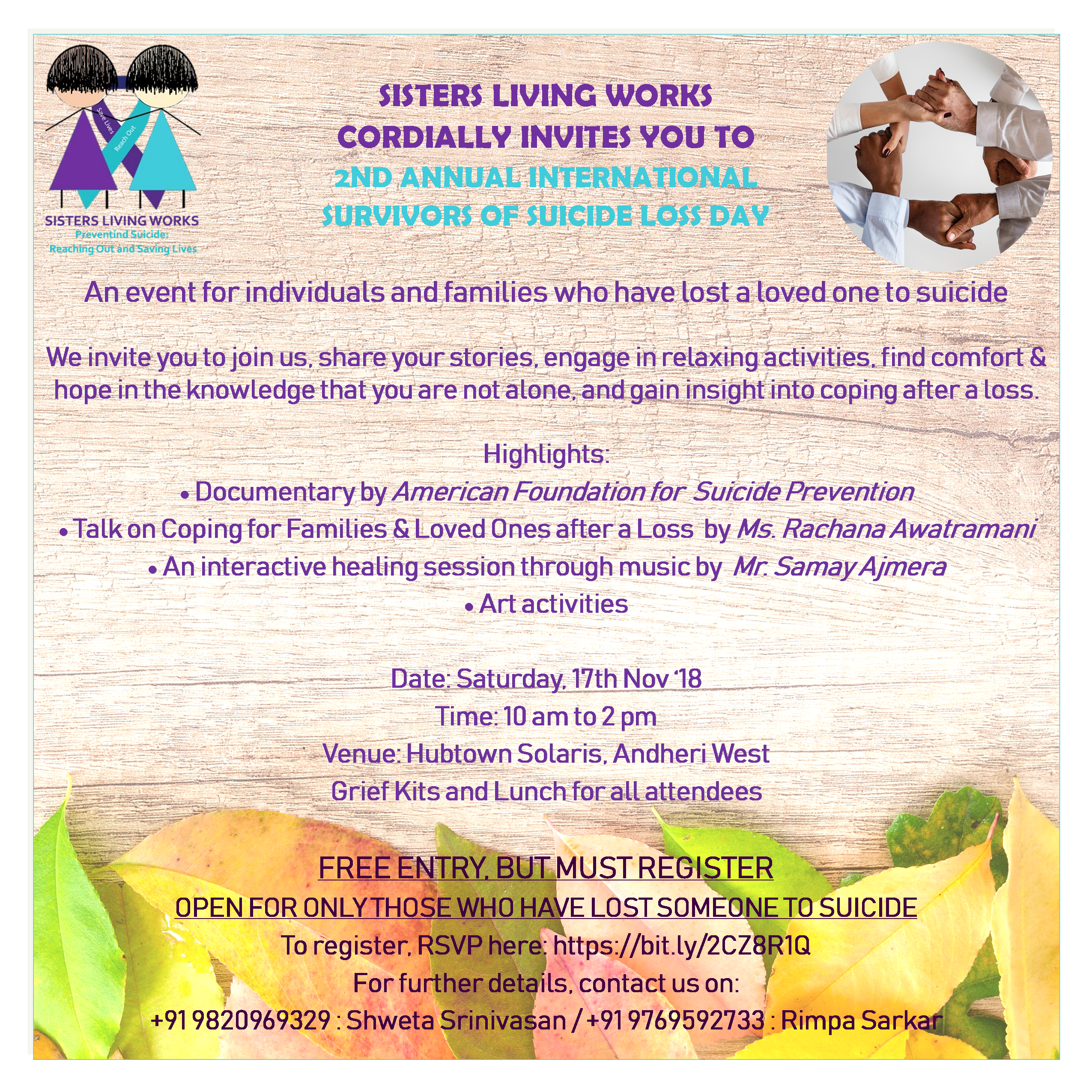 International Survivors of Suicide Loss Day is recognized on 17th November this year and we are organizing an intimate gathering of individuals and families who have lost a loved one to suicide. The gathering will have engaging talks, activities, and interactions to help survivors of suicide loss cope with their grief and stand with each […]